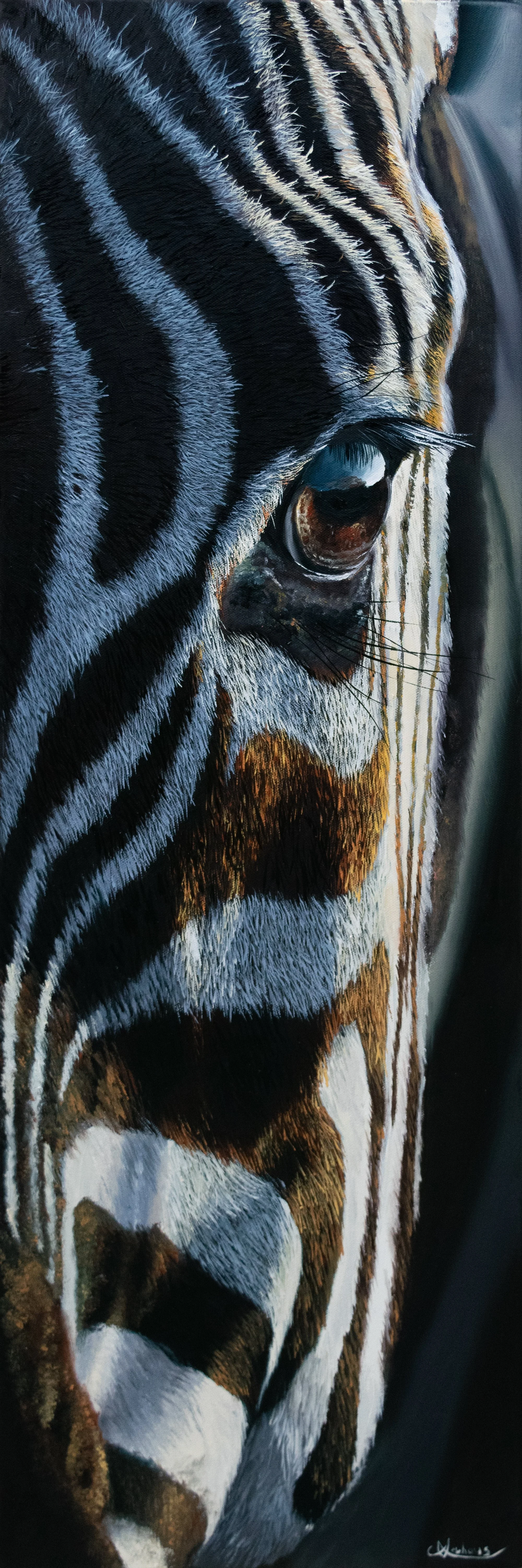 The sharp contrast of the black and white stripes surrounds the soft eye, which holds a world of untold secrets.