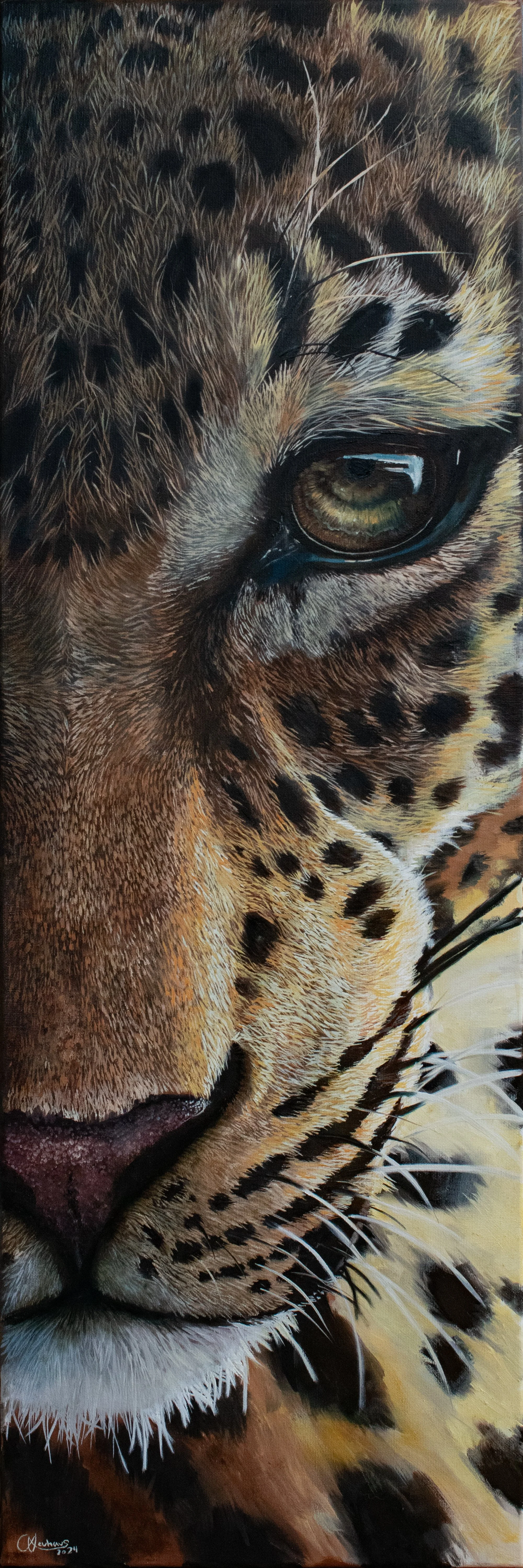 This close-up of a leopard’s eye pulls you right into the heart of the wild. The piercing eye shines against its sleek, spotted fur, giving it an almost hypnotic presence.