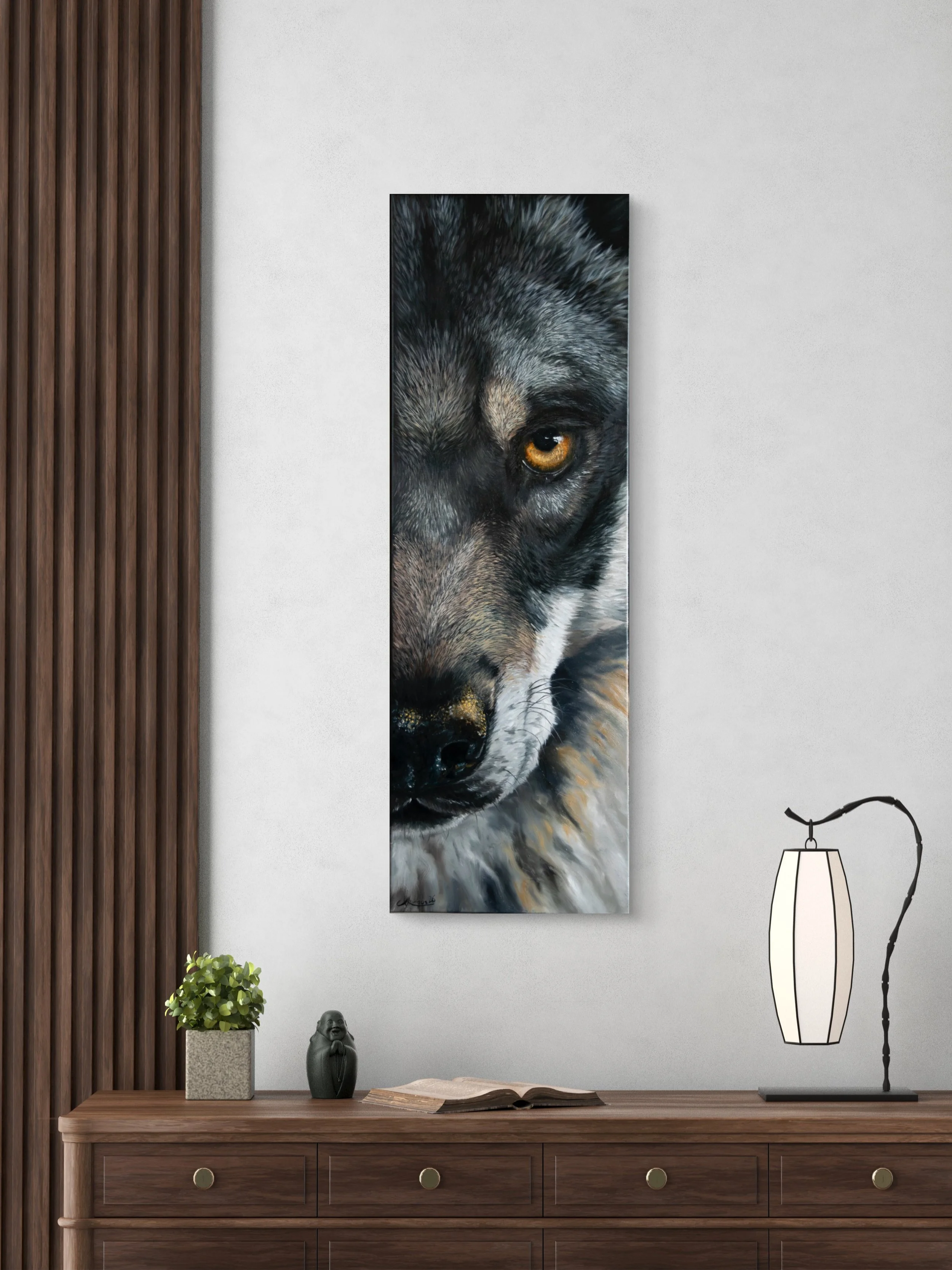A close up of a wolfs face. Her eye and her nose are made with gold imitation leaves in combination with gold oil paint, which gives this painting a truly unique touch.